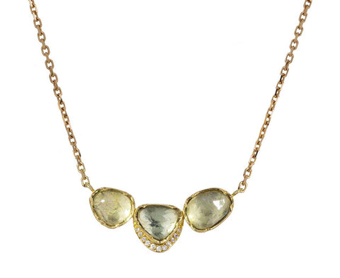 With its subdued color and hint of sparkle, this Brooke Gregson necklace offers a casual, earthy elegance. A trio of shimmering rose cut aquamarine are covered in surfaces of light reflecting facets to reveal their tones of pale, warm, aqua yellow-green. They are set in a finely detailed, subtly pinched and meticulously hand crafted curved bar of 18K gold. A row of sparkling diamonds follows the lower curve of the center stone. The pendant hangs from the center of the 18K yellow gold adjustable length chain.